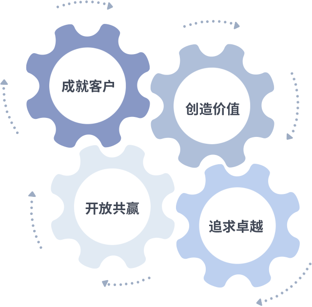 成就客户是一切决策的出发点,,,创造价值是衡量所有工作的标准,,,追求卓越是我们做事做人的态度,,开放共赢是我们的格局也是最终的结果。。价值观的齿轮环环相扣,,推动着组织里的每个人不断向前。。。。